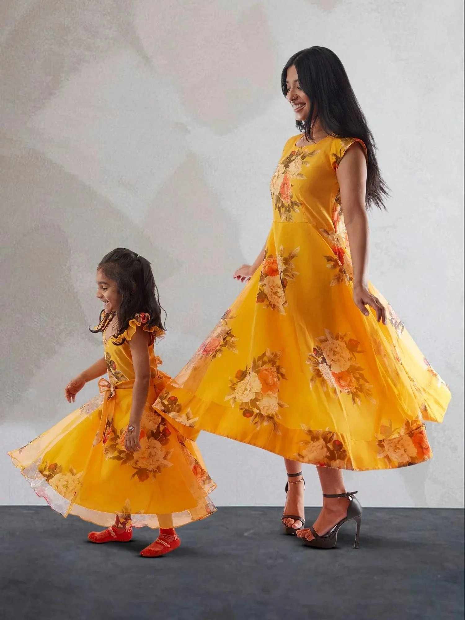 Experience the joy of twinning with our Mommy n Me Yellow Floral Print Organza Dresses. This charming set includes matching dresses featuring a vibrant yellow hue adorned with delicate floral prints on lightweight organza fabric.